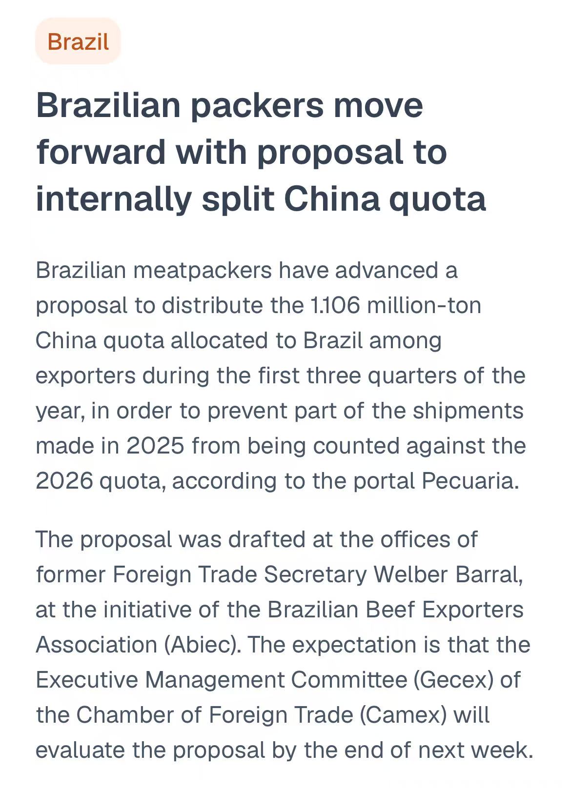 此举意在确保当年发运的牛肉能在同一自然年内清关。据估算,由于跨年运输问题,2026年巴西实际可用的对华出口额度仅剩约70万吨,相当于全年配额已被“预支”了近三成。