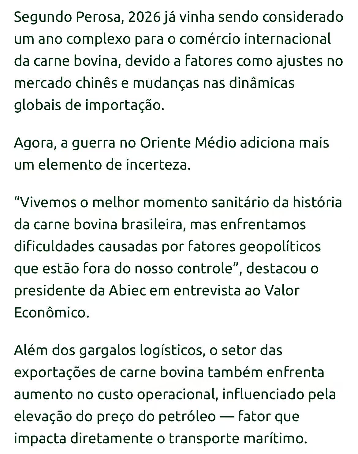 巴西肉类出口商协会(Abiec)主席佩罗萨警告说,美国、以色列与伊朗的冲突,可能影响到巴西30%到40%的牛肉出口。