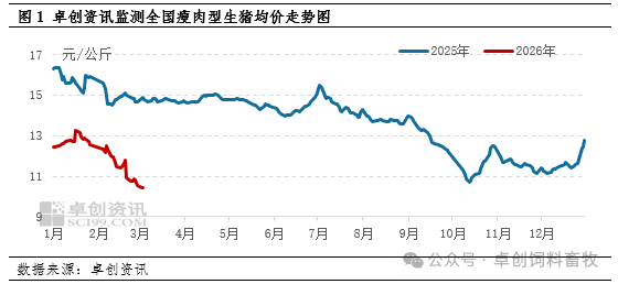 2026年春节后猪价下滑,跌出近年来的新低点。卓创资讯监测,截至3月4日,2026年春节复工后8个工作日的生猪均价为10.69元/公斤,较2025年春节后同期水平下滑4.16元/公斤,跌幅28.03%。其中3月3-4日的生猪价格分别为10.45元/公斤和10.43元/公斤,更是超越2025年10月13日的价格创下了新的低点。春节后需求降至年内冰点,而且养殖企业走货意向强,供大于求态势明显,猪价承压下滑。