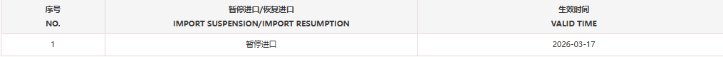 暂停受理乌拉圭1家牛肉企业(注册编码为:344)自2026年3月17日(含)起启运的输华产品进口申报。
