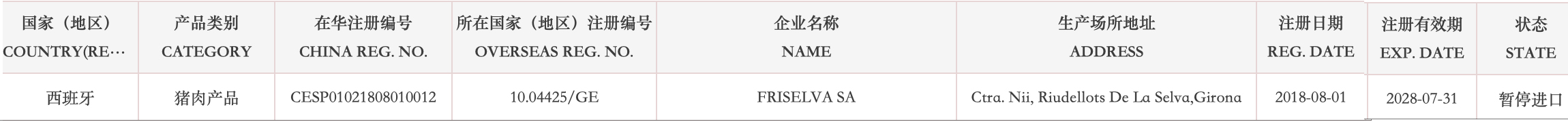 暂停受理西班牙1家猪肉企业(注册编码为:10.04425/GE)自2026年3月19日(含)起启运的输华产品进口申报。