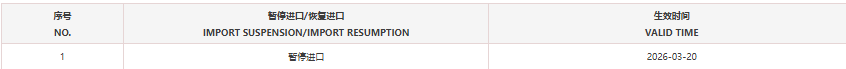 暂停受理美国1家牛肉企业(注册编码为:47264)自2026年3月20日(含)起启运的输华产品进口申报。