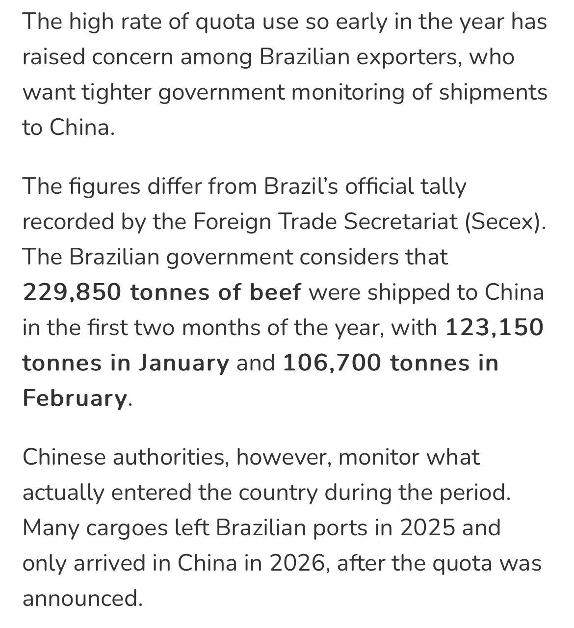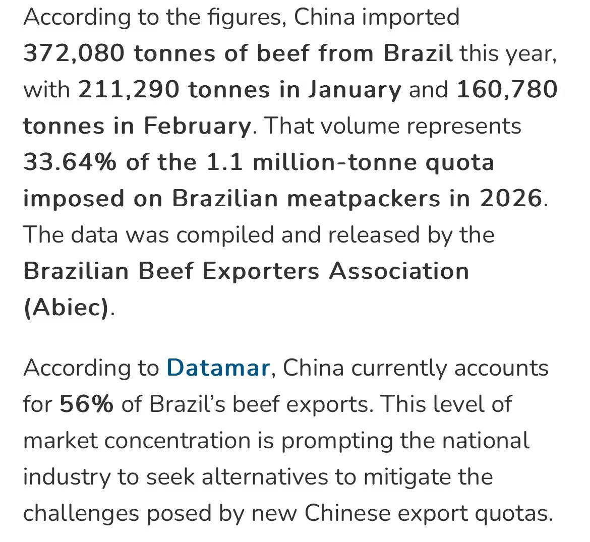 据中国海关3月20日公布的数据,2026年1-2月,中国自巴西进口牛肉37.2万吨,占全年110.6万吨配额的33.6%。其中1月21.1万吨,2月16.1万吨。这一数据由巴西肉类出口工业协会(ABIEC)整理发布。
