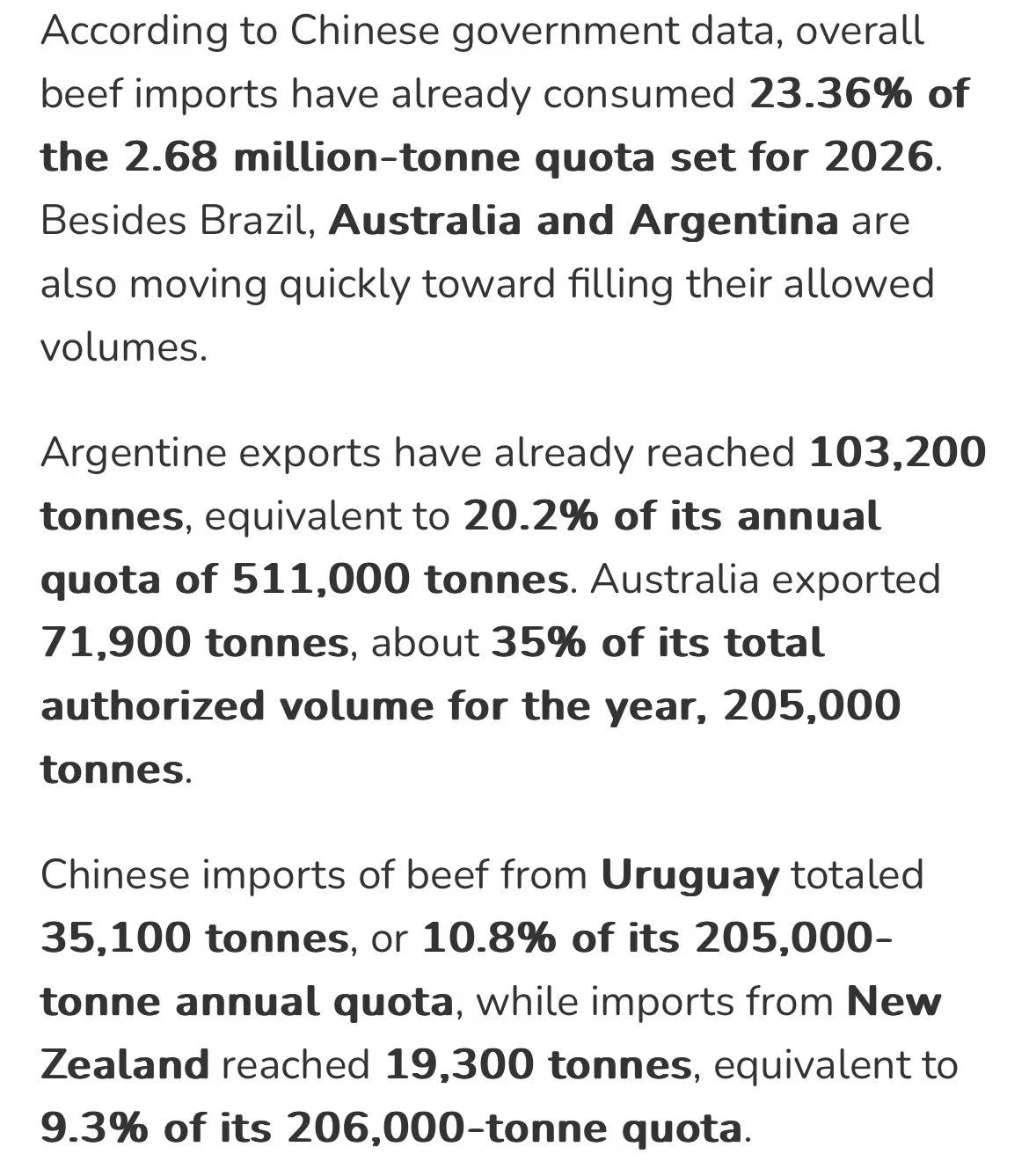 第二,对国内进口商来说,配额进度是今年拿货的核心变量。若巴西后期配额紧张,到岸价大概率走高;若配额提前耗尽,下半年巴西货源可能断档。建议持续关注巴西政府是否出台配额管控措施,同时评估阿根廷、乌拉圭等其他来源国的替代空间。