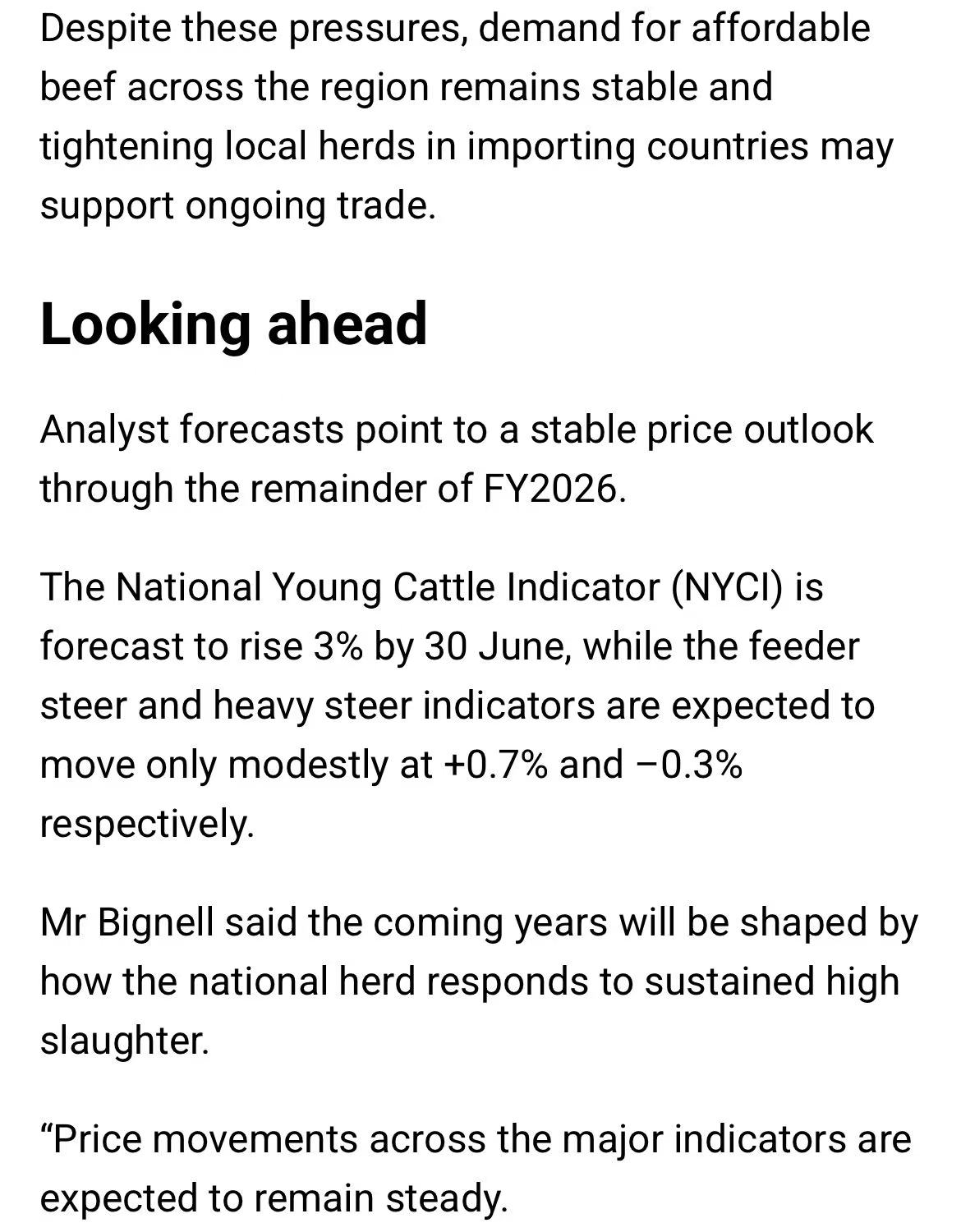 出口方面,在创纪录产量和全球供应趋紧的支撑下,预计2026年澳大利亚牛肉出口量将达到230万吨(胴体重),同样创历史新高。美国国内供应减少持续推动对澳大利亚草饲牛肉的需求。