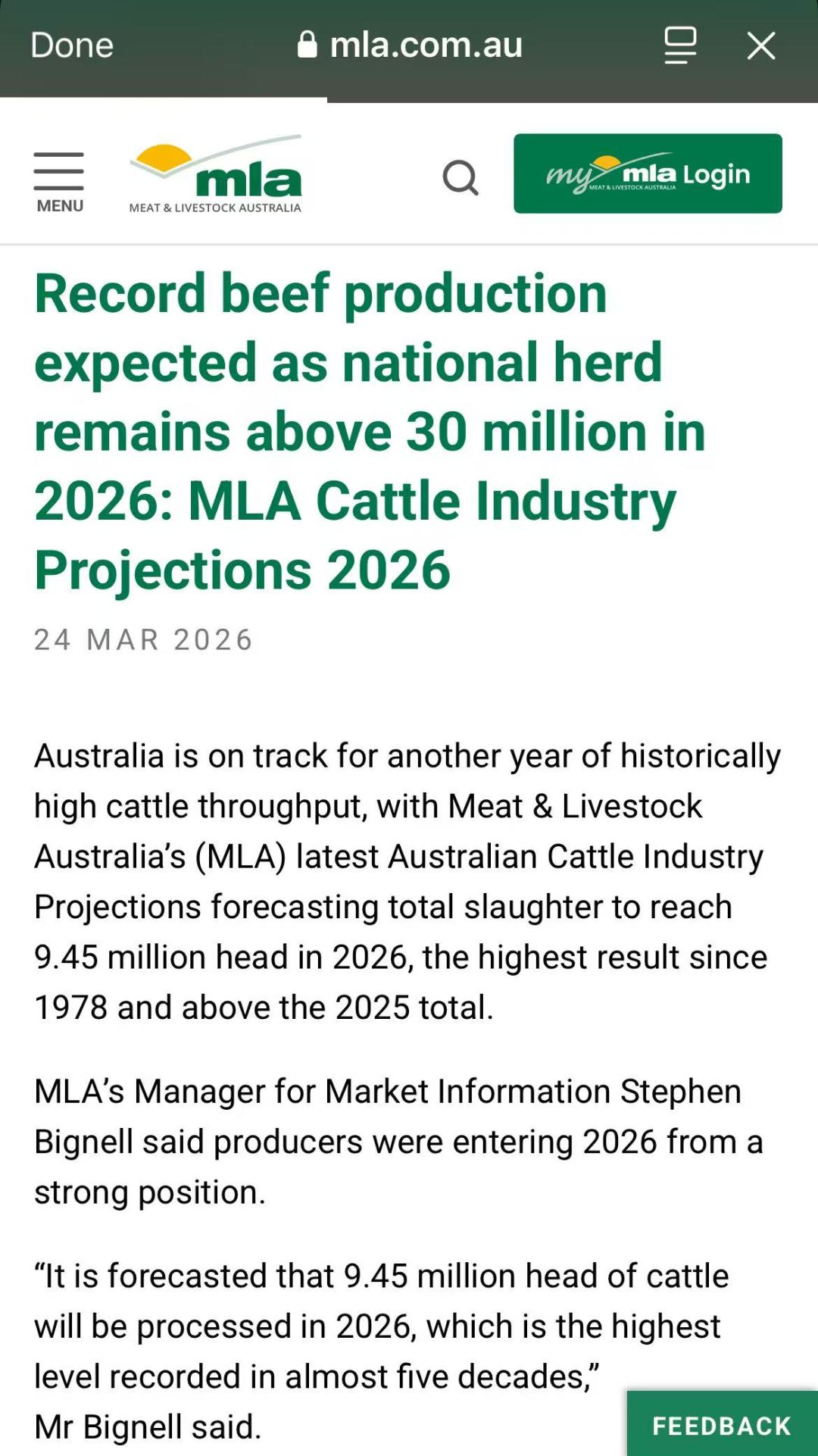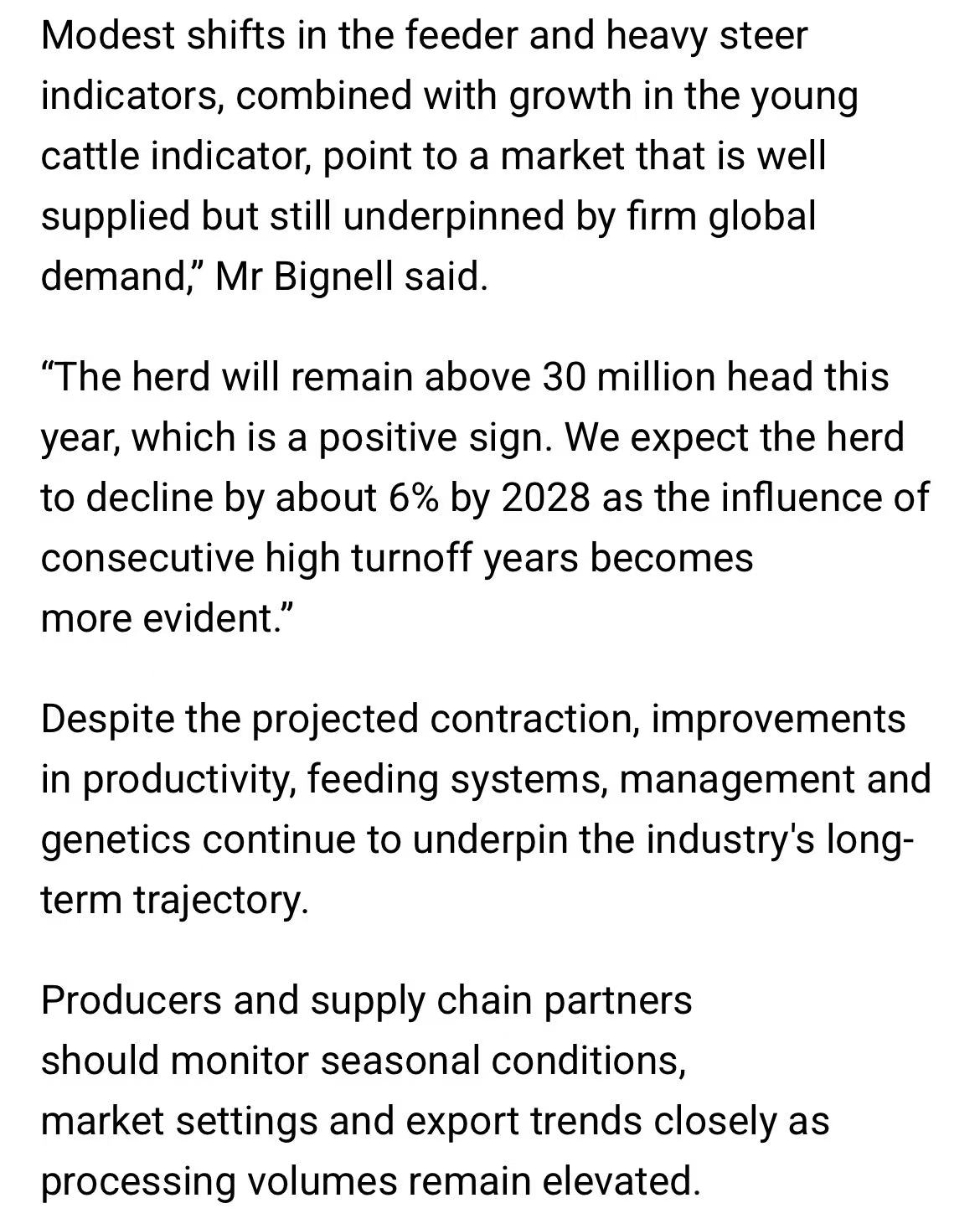 澳大利亚肉类及畜牧业协会(MLA)最新发布的《2026年澳大利亚肉牛行业展望报告》预计,2026年澳大利亚肉牛屠宰量将达到945万头,创下自1978年以来的历史新高。全国牛群规模预计保持在3000万头以上,约为3078万头,较上年微降1%。