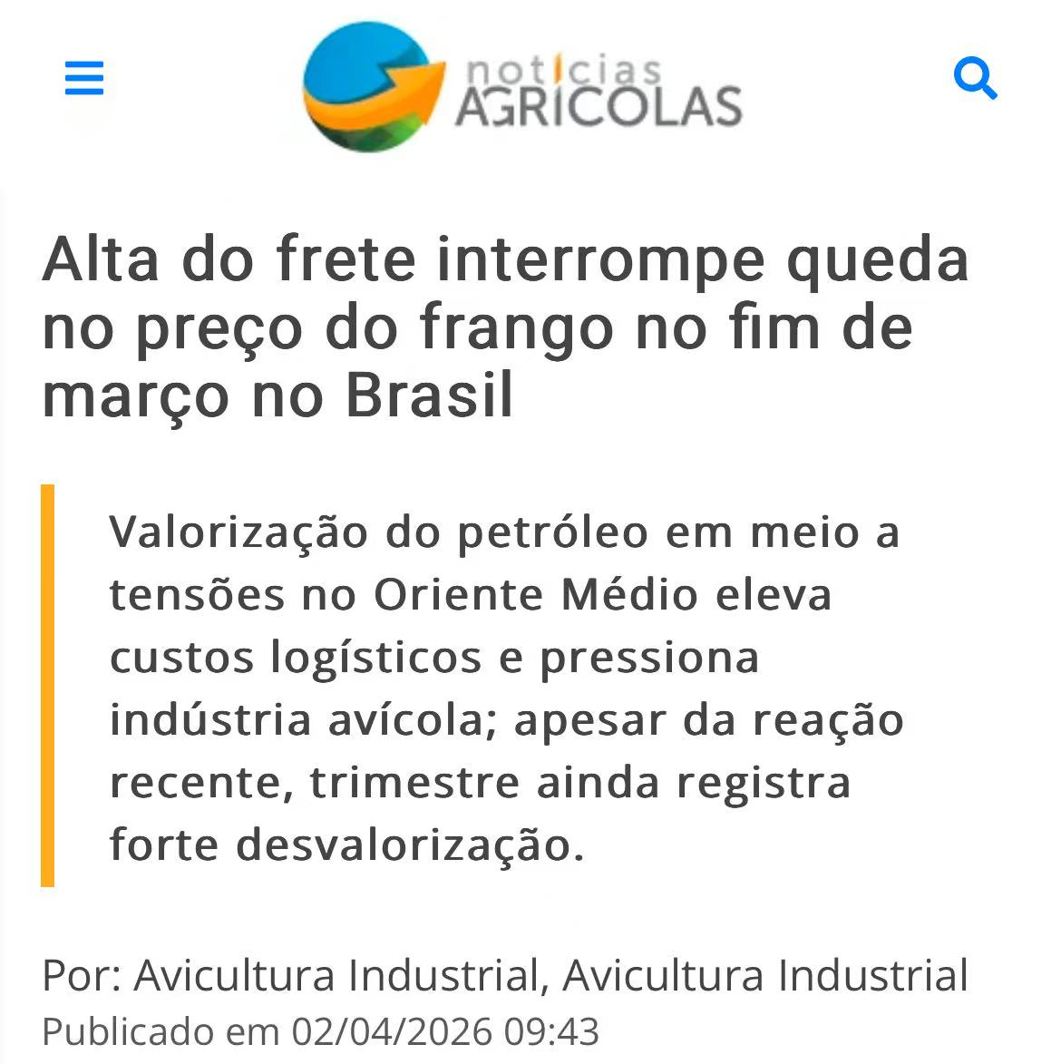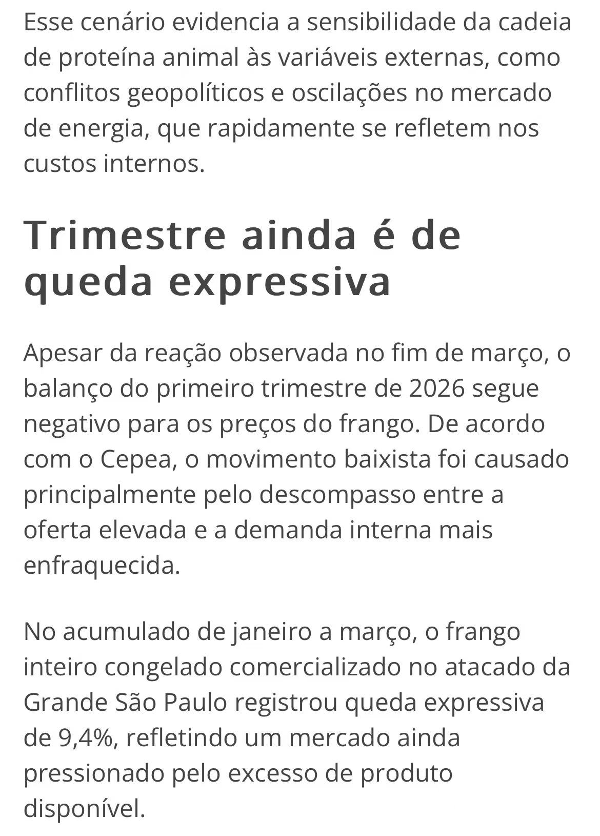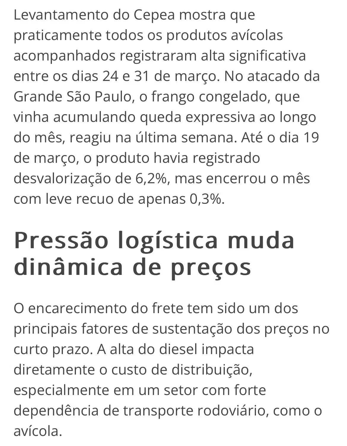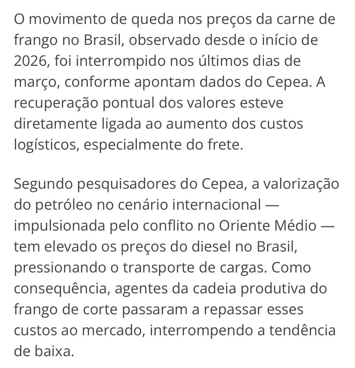 Cepea数据显示,大圣保罗批发市场冷冻鸡肉此前整月累计下跌6.2%,但月底跌幅收窄至0.3%,最后一周几乎所有禽类产品价格上涨。运费上涨是打断跌势的直接推手,家禽产业链开始将运输成本转嫁给市场。