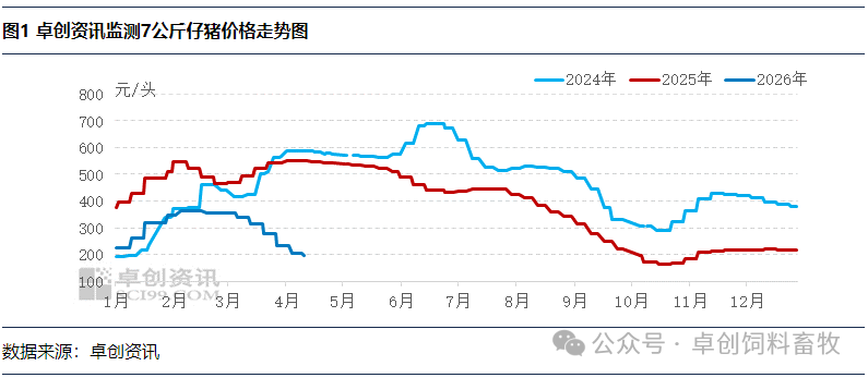 此前,仔猪价格经历了持续下行过程,据卓创资讯统计,截止到4月10日全国7公斤仔猪均价为196.61元/头,跌破200元/头大关,创近三年新低。但近期这一态势得到扭转,部分地区仔猪价格率先反弹,市场情绪逐步修复。