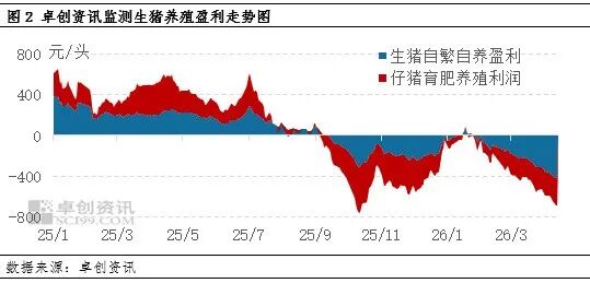 截止到4月15日,卓创资讯监测2026年生猪自繁自养盈利平均每头亏损159元左右,而2025年同期为盈利235元左右;仔猪育肥平均每头亏损143元左右,2025年同期为盈利194元左右。养殖端长期处于亏损状态,首先影响其对后市的看涨信心。2026年养殖端几乎处于持续亏损状态,对后市心态相对悲观,出栏意愿加强,多有降重操作,但下游消化速度缓慢,养殖端存在被动压栏情况,选择持续降价出栏。其次,影响养殖端的资金状况,在持续亏损的影响下,部分企业资金压力不断提升,选择销售仔猪来缓解现金流压力。