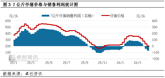 2026年1月下旬开始猪价出现下降趋势,春节假期过后持续走低,养殖亏损加剧,养殖端对下半年生猪行情信心减弱,补栏仔猪积极性下降,导致母猪场仔猪销售乏力,仔猪价格下跌,利润由盈转亏。据卓创资讯监测数据显示,截至4月10日,2025年四季度7公斤仔猪均价为305.62元/头,较2025年同期降幅37.93。因仔猪价格持续下降,7公斤仔猪销售于3月下旬进入亏损状态,截至4月10日,7公斤仔猪销售亏损为78.39元/头。