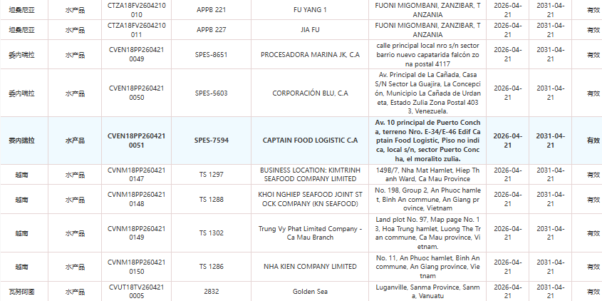 33.海关总署新增委内瑞拉3家水产品企业输华注册(注册编码为:SPES-8651、SPES-5603、SPES-7594自2026年4月21日(含)后生产的输华产品进口准入。