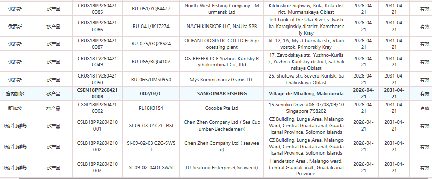 28.海关总署新增塞内加尔1家水产品企业输华注册(注册编码为:002/03/C自2026年4月21日(含)后生产的输华产品进口准入。
