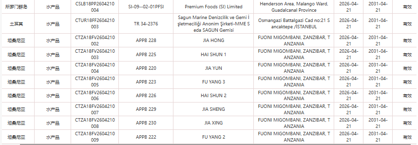 32.海关总署新增坦桑尼亚10家水产品企业输华注册(注册编码为:APPB 228、APPB 225、APPB 220、APPB 223、APPB 226、APPB 229、APPB 230、APPB 222自2026年4月21日(含)后生产的输华产品进口准入。