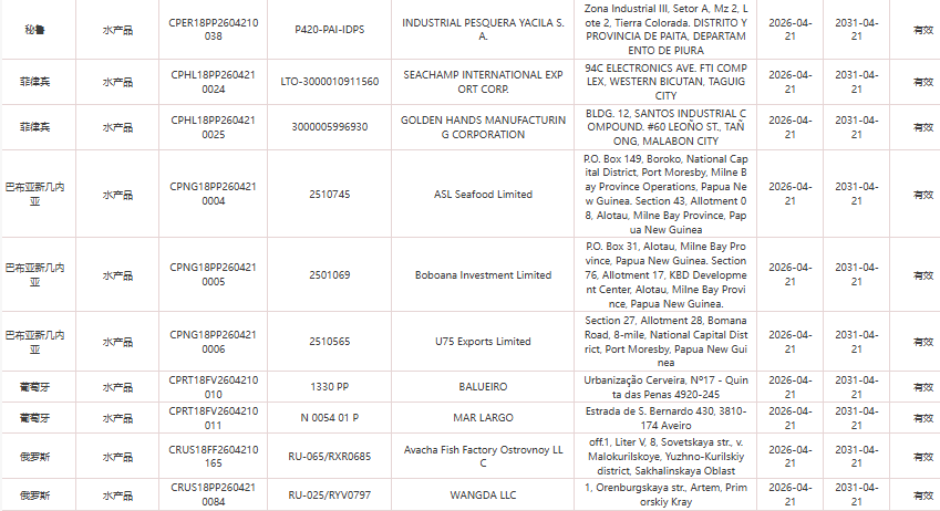 24.海关总署新增菲律宾2家水产品企业输华注册(注册编码为:LTO-3000010911560、3000005996930)自2026年4月21日(含)后生产的输华产品进口准入。