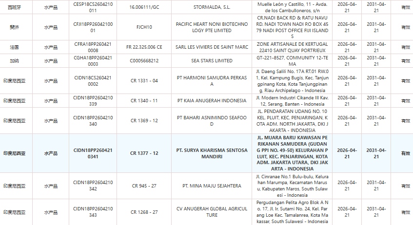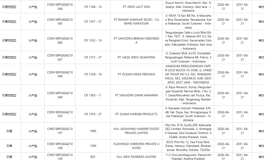 10.海关总署新增印度尼西亚13家水产品企业输华注册(注册编码为:CR 1331 - 04、CR 1340 - 11、CR 1369 - 12、CR 1377 - 12、CR 945 - 27、CR 1268 - 27、CR 1184 - 16、CR 1357 - 27、CR 1352 - 16、CR 1372 - 27、CR 1338 - 16CR 1360 - 11、CR 1076 - 27自2026年4月21日(含)后生产的输华产品进口准入。