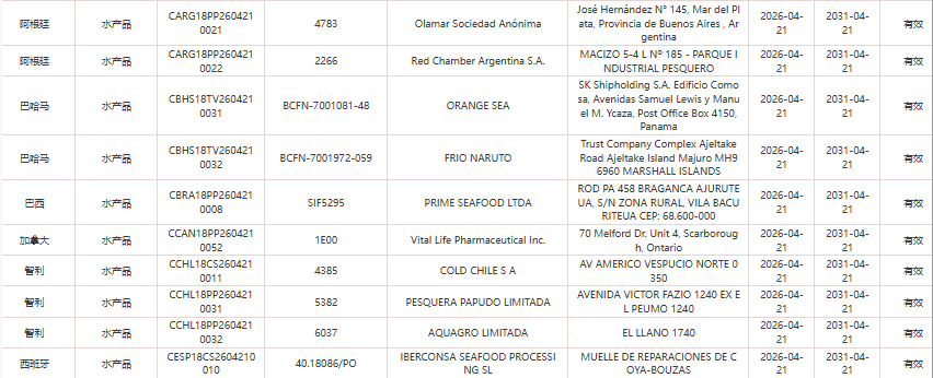 5.海关总署新增智利3家水产品企业输华注册(注册编码为:4385、5382、6037)自2026年4月21日(含)后生产的输华产品进口准入。