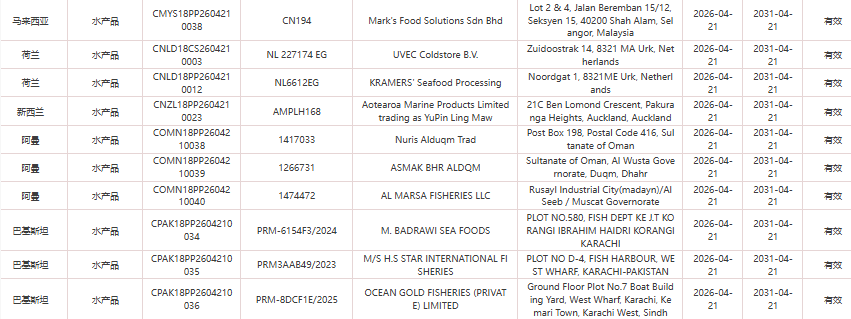 22.海关总署新增巴基斯坦3家水产品企业输华注册(注册编码为:PRM-6154F3/2024、PRM3AAB49/2023、PRM-8DCF1E/2025)自2026年4月21日(含)后生产的输华产品进口准入。