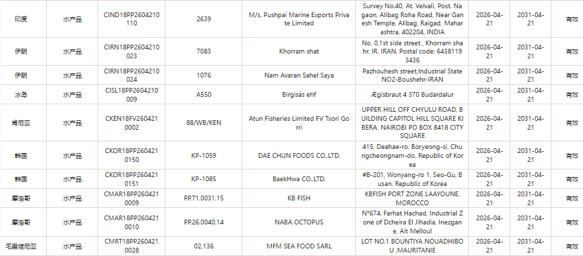 16.海关总署新增摩洛哥2家水产品企业输华注册(注册编码为:PP.71.0031.15、PP.26.0040.14)自2026年4月21日(含)后生产的输华产品进口准入。