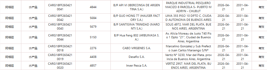 1.海关总署新增阿根廷9家水产品企业输华注册(注册编码为:4844、5684、5679、5150、2276、4408、4857、4783、2266自2026年4月21日(含)后生产的输华产品进口准入。