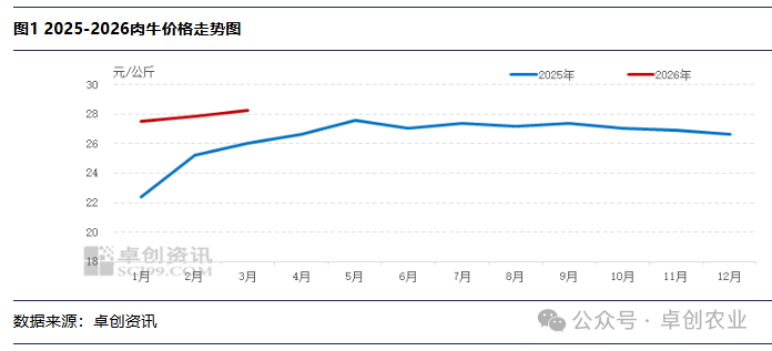 【导语】2026年4月,国内肉牛市场延续稳中有涨态势。前期行业深度亏损驱动的能繁母牛去化效应,正按照约2.5年的生产周期加速传导至商品牛出栏环节。据卓创资讯监测,当前市场牛源供给持续收紧,养殖端看涨情绪浓厚,压栏惜售现象普遍,叠加进口政策收紧对国内市场的托底作用,肉牛价格上行趋势进一步强化。