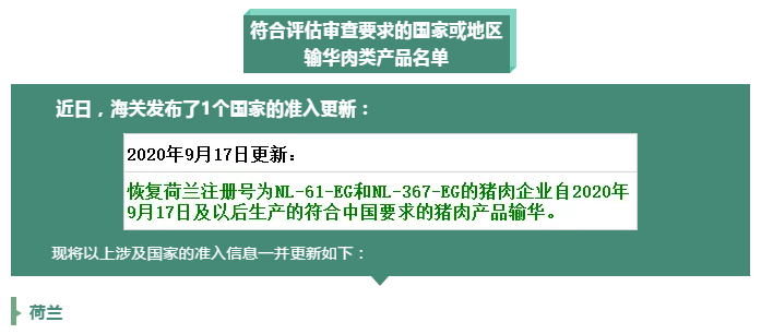 ⬆ 恢复荷兰注册号为NL-61-EG和NL-367-EG的猪肉企业自2020年9月17日及以后生产的符合中国要求的猪肉产品输华。