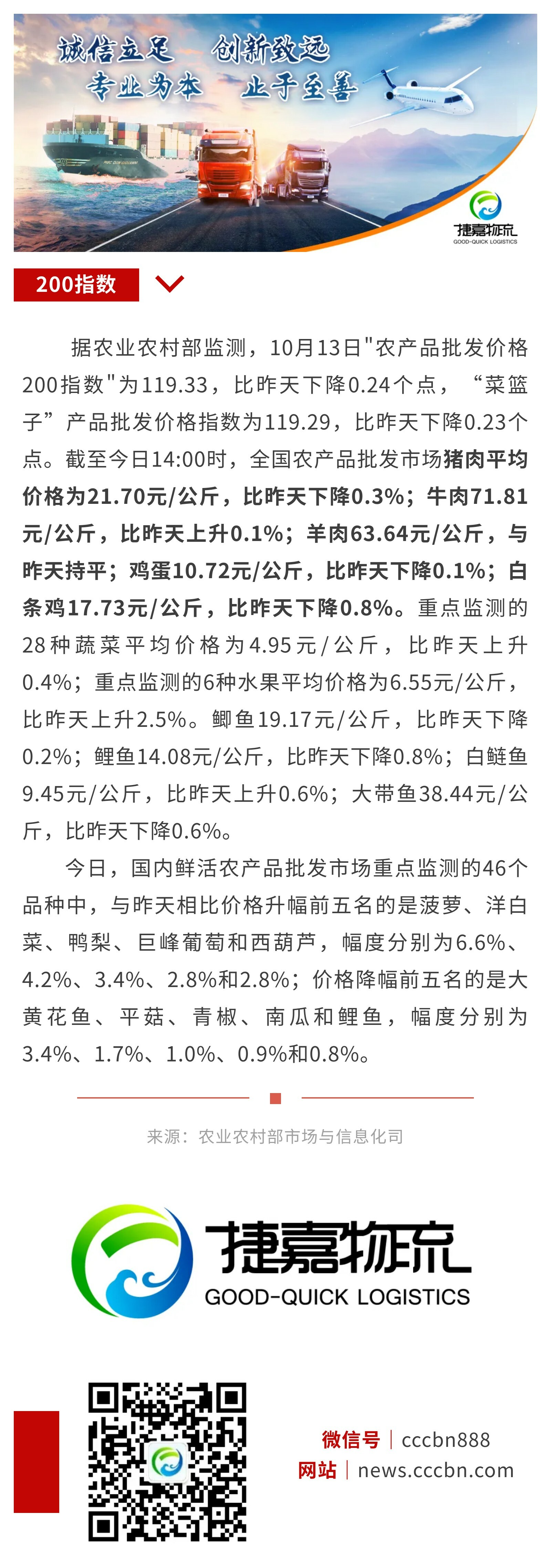 10月13日:"农产品批发价格200指数"比昨天下降0.24个点