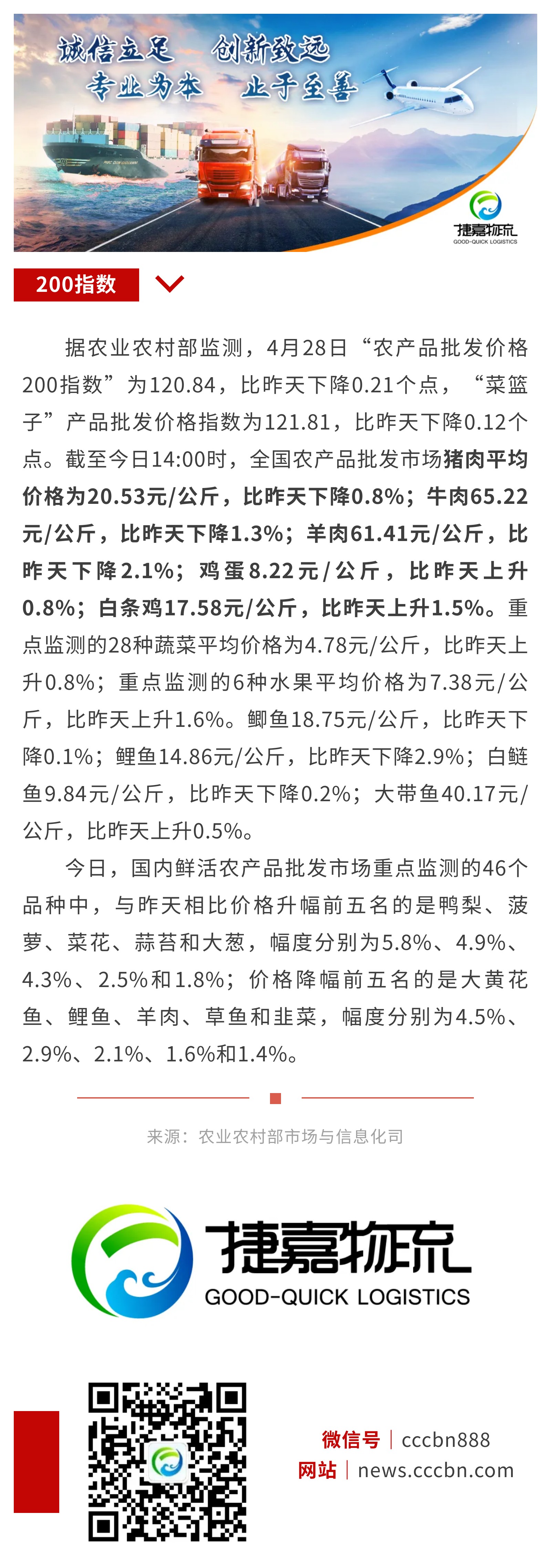 4月28日:“农产品批发价格200指数”比昨天下降0.21个点