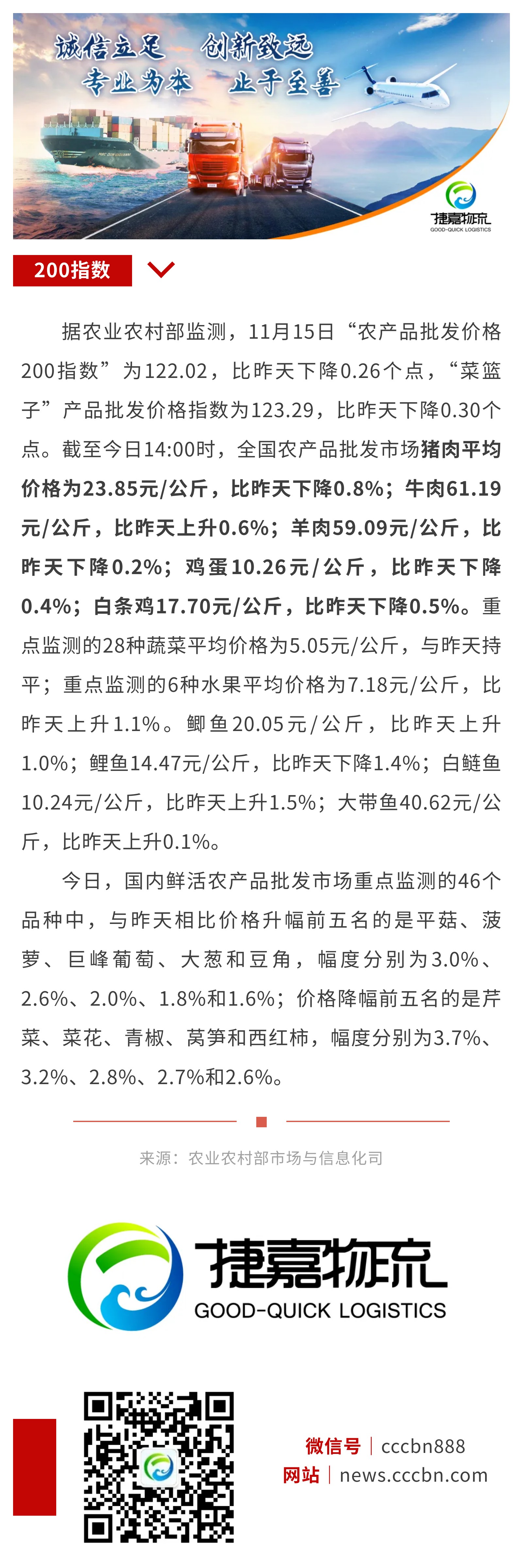 11月15日:“农产品批发价格200指数”比昨天下降0.26个点