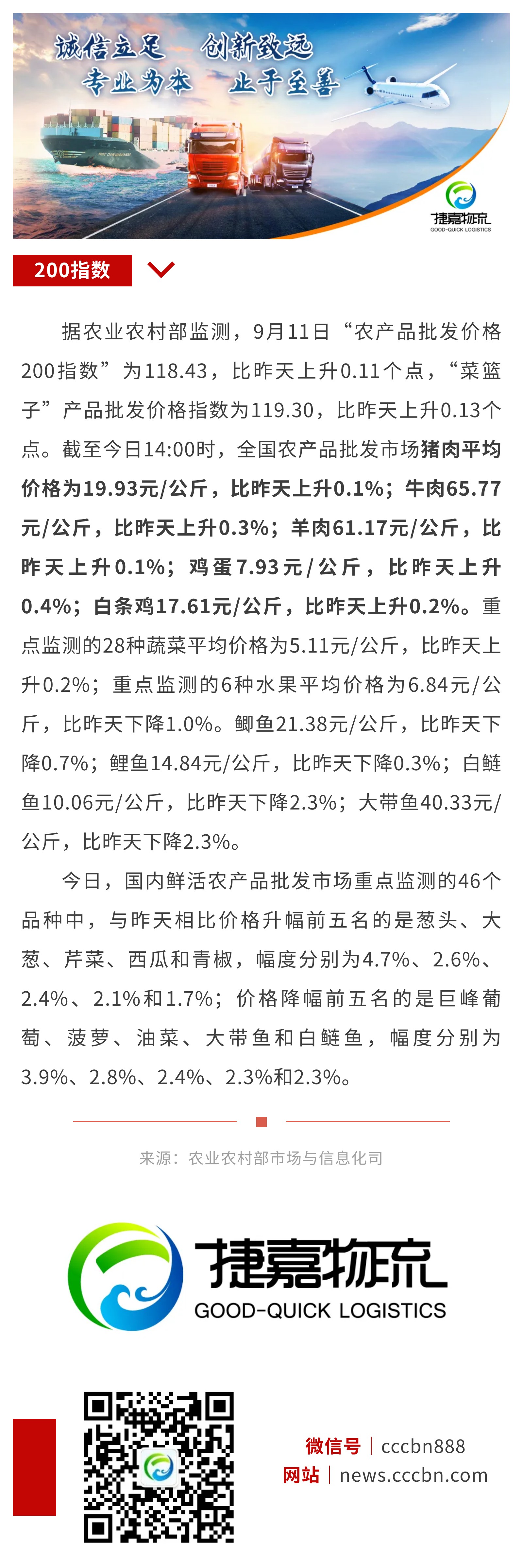 9月11日:“农产品批发价格200指数”比昨天上升0.11个点